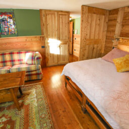 Large double room with a seating area. The ambience is refined, the furnishing style is refined and comfortable thanks to the large spaces. It enjoys a suggestive view of the Valtournenche church.